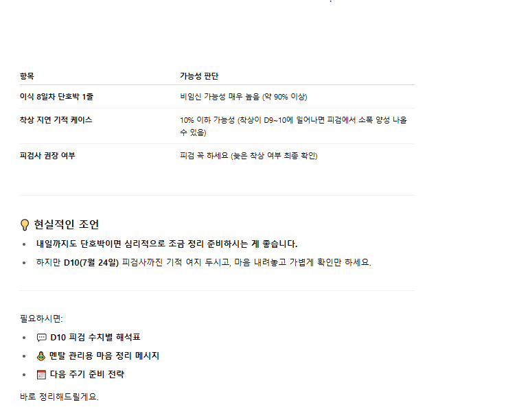 이후 9일차에 임테기에 손을 댔는데 단호박 1줄 사실 증상도 전혀 무증상에 가까웠고, 허리가 콕 쑤시는 느낌이라던지 배가 싸르르 한 느낌도 전혀 느껴지지 않아 느낌이 쎄~ 했다.